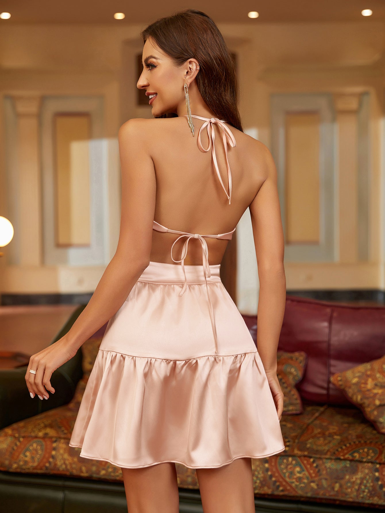 cut out tie back halter mini dress#color_pink