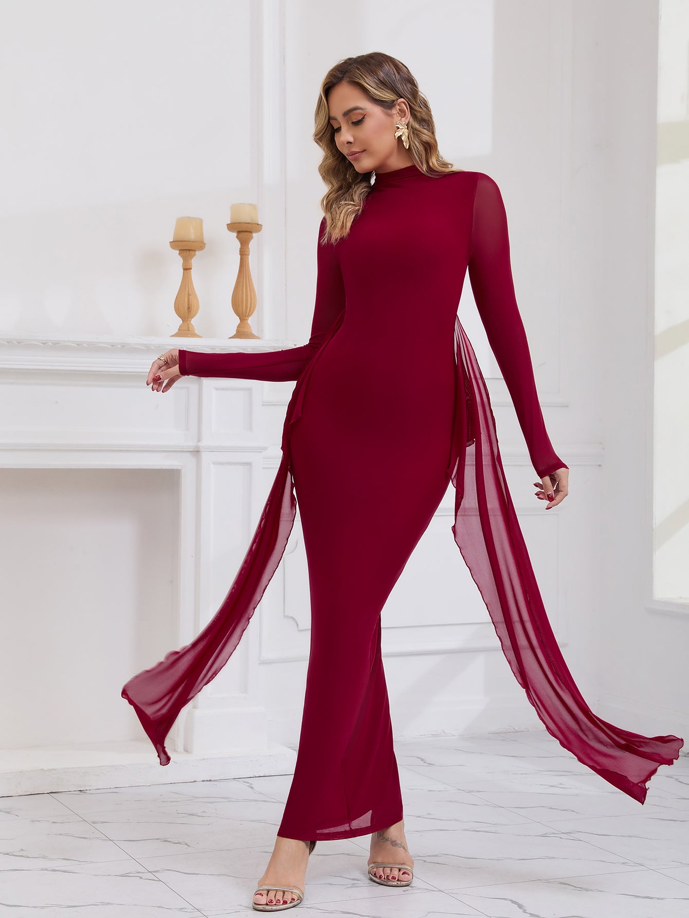 Long Sleeve Backless Ribbon Trim Mesh Dress#color_wine