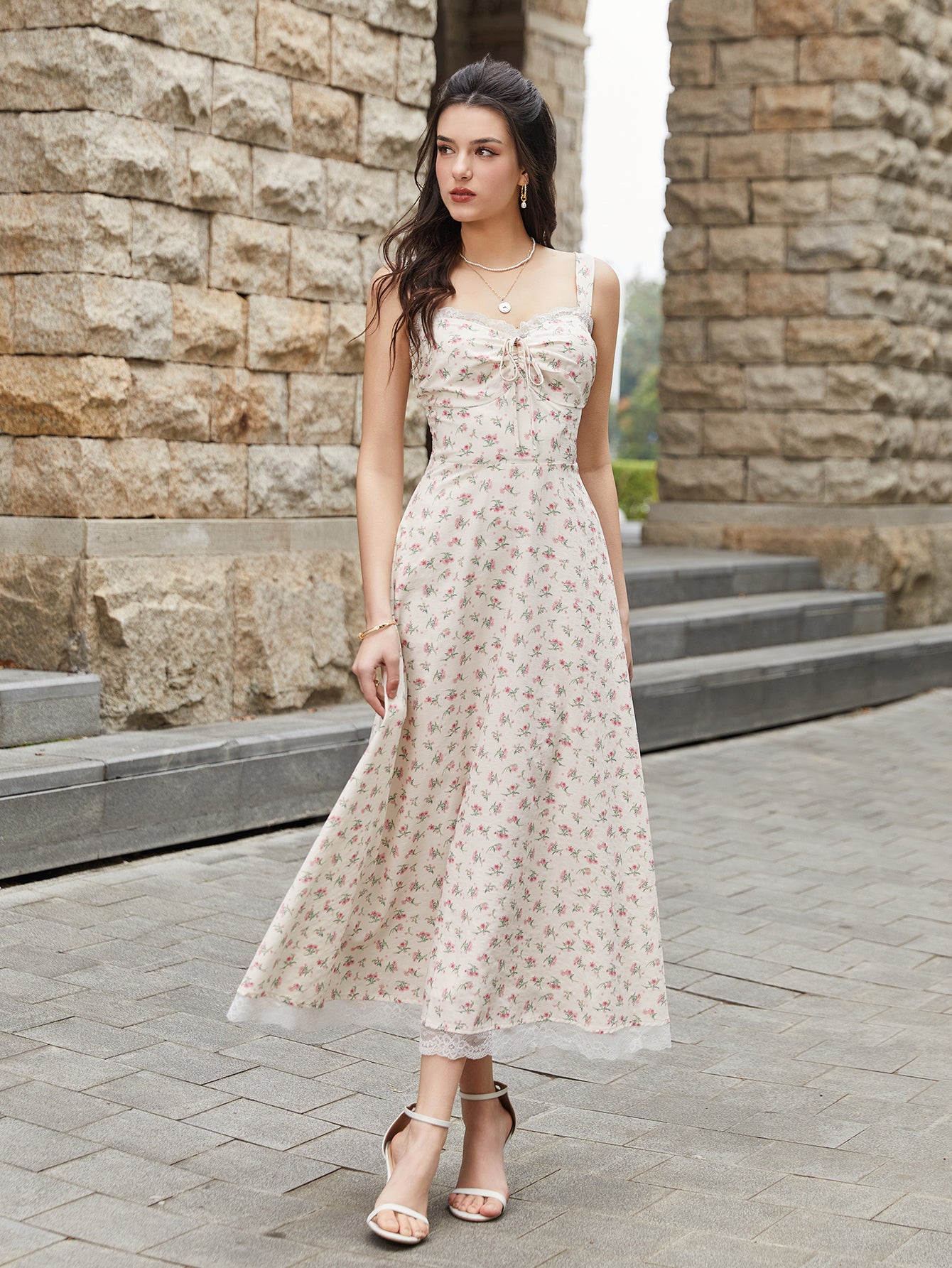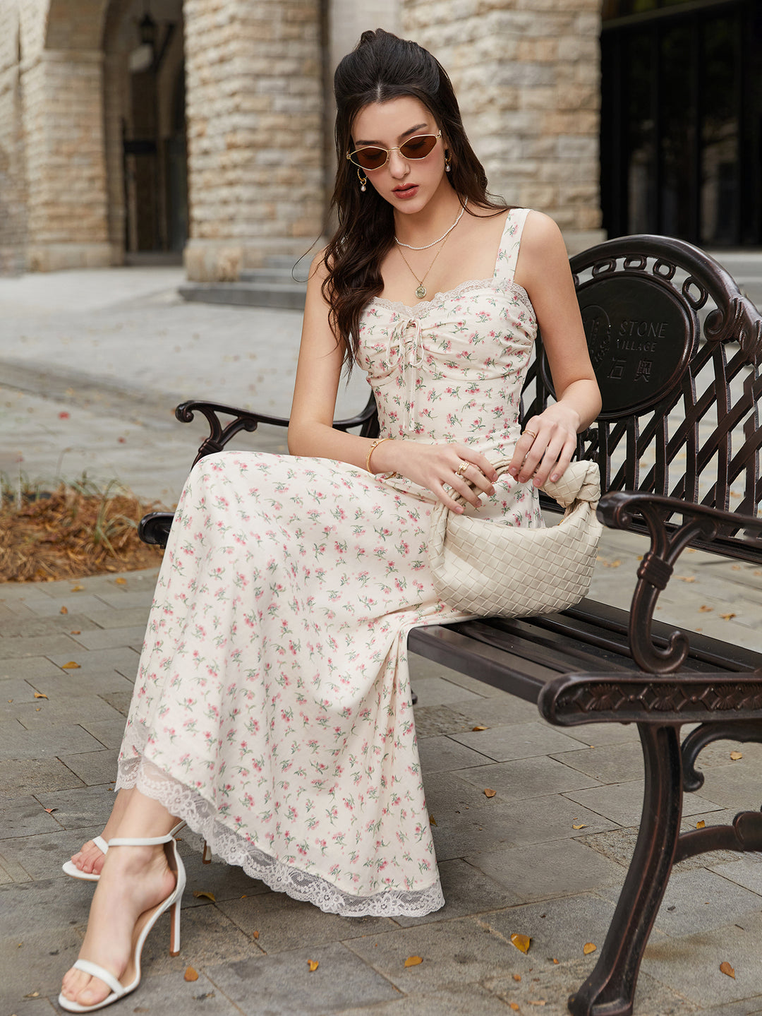 Lace Spliced Tie Front Floral Print Maxi Dress