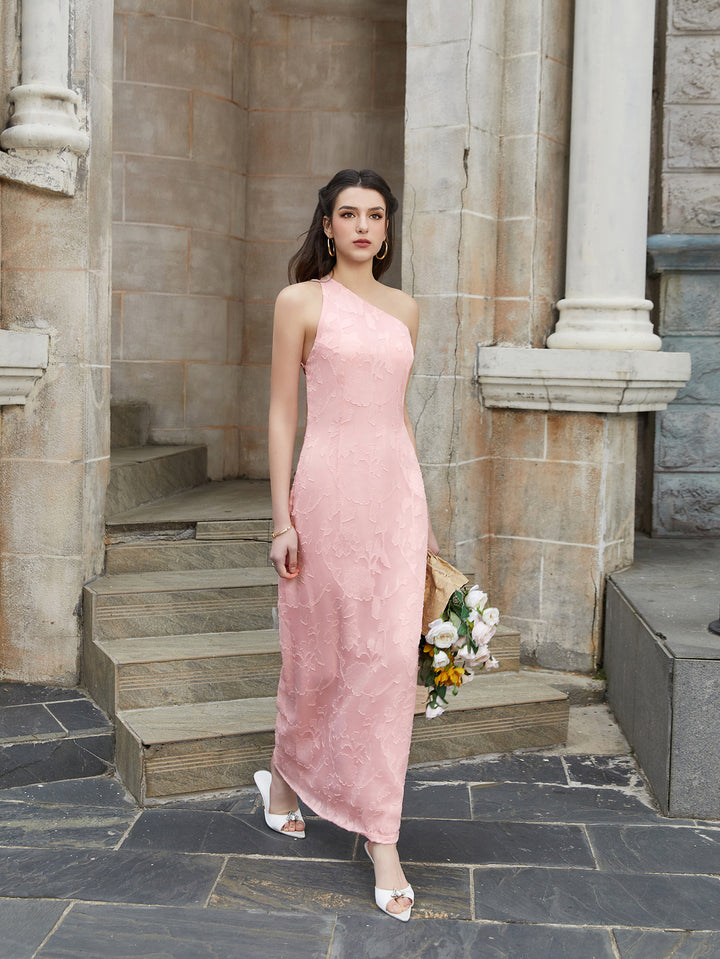one shoulder backless tie back jacquard long dress#color_pink