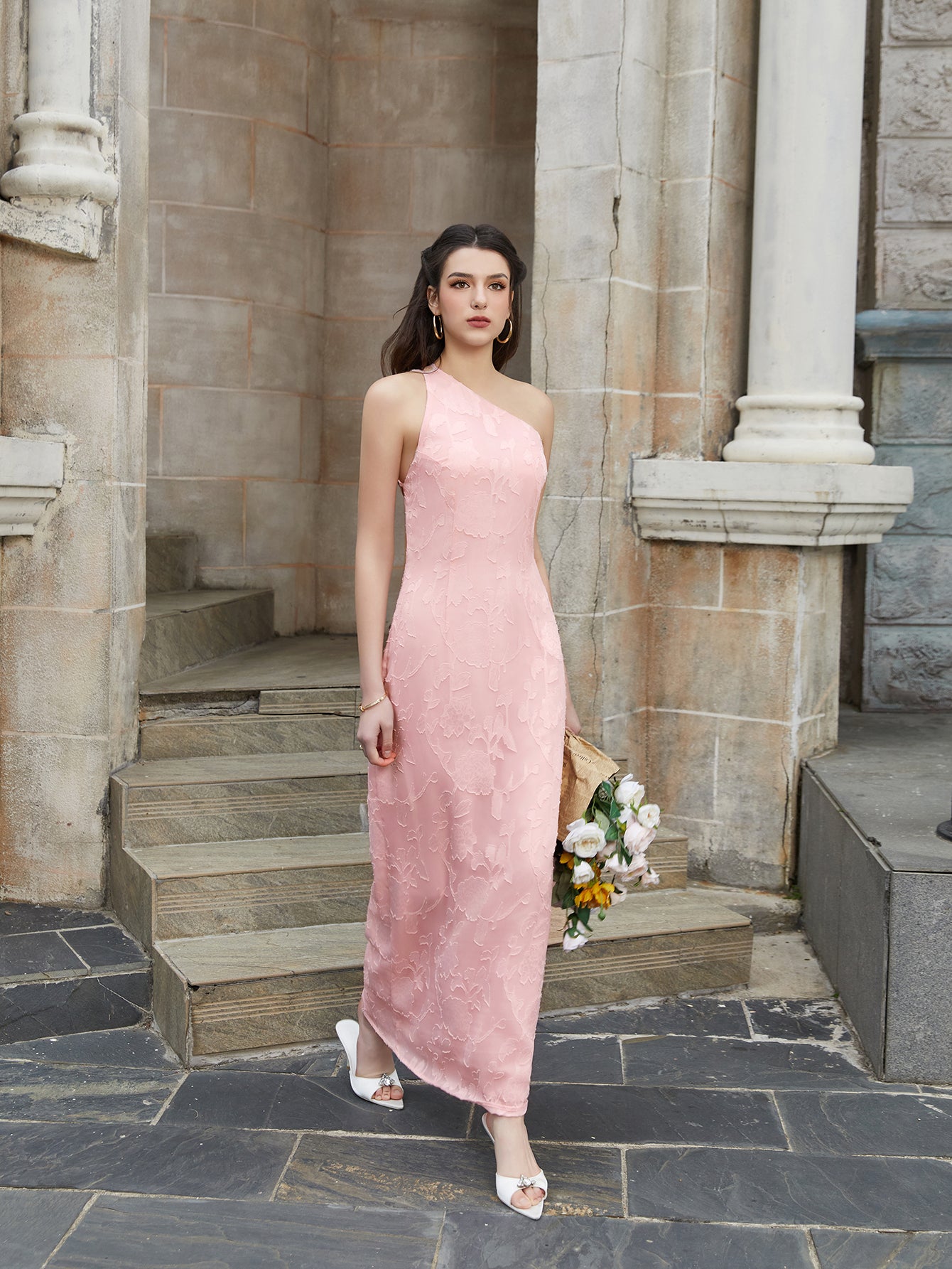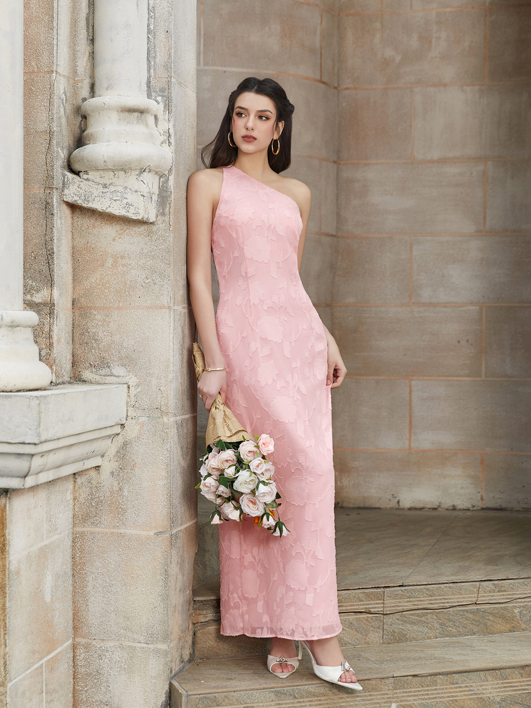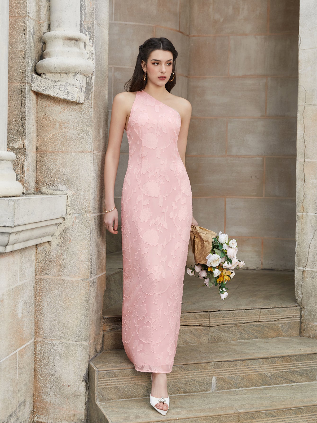 tie back backless one shoulder jacquard long dress#color_pink