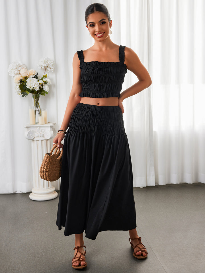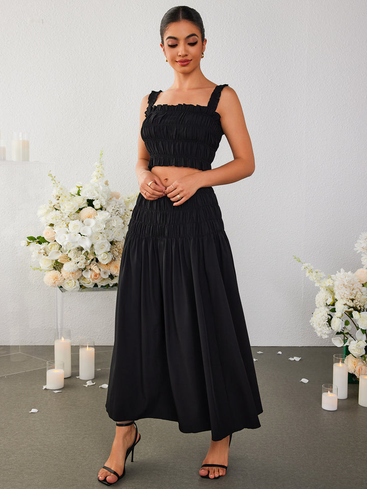 Ruched Backless Crop Top&Ruffle Flared Hem Skirt