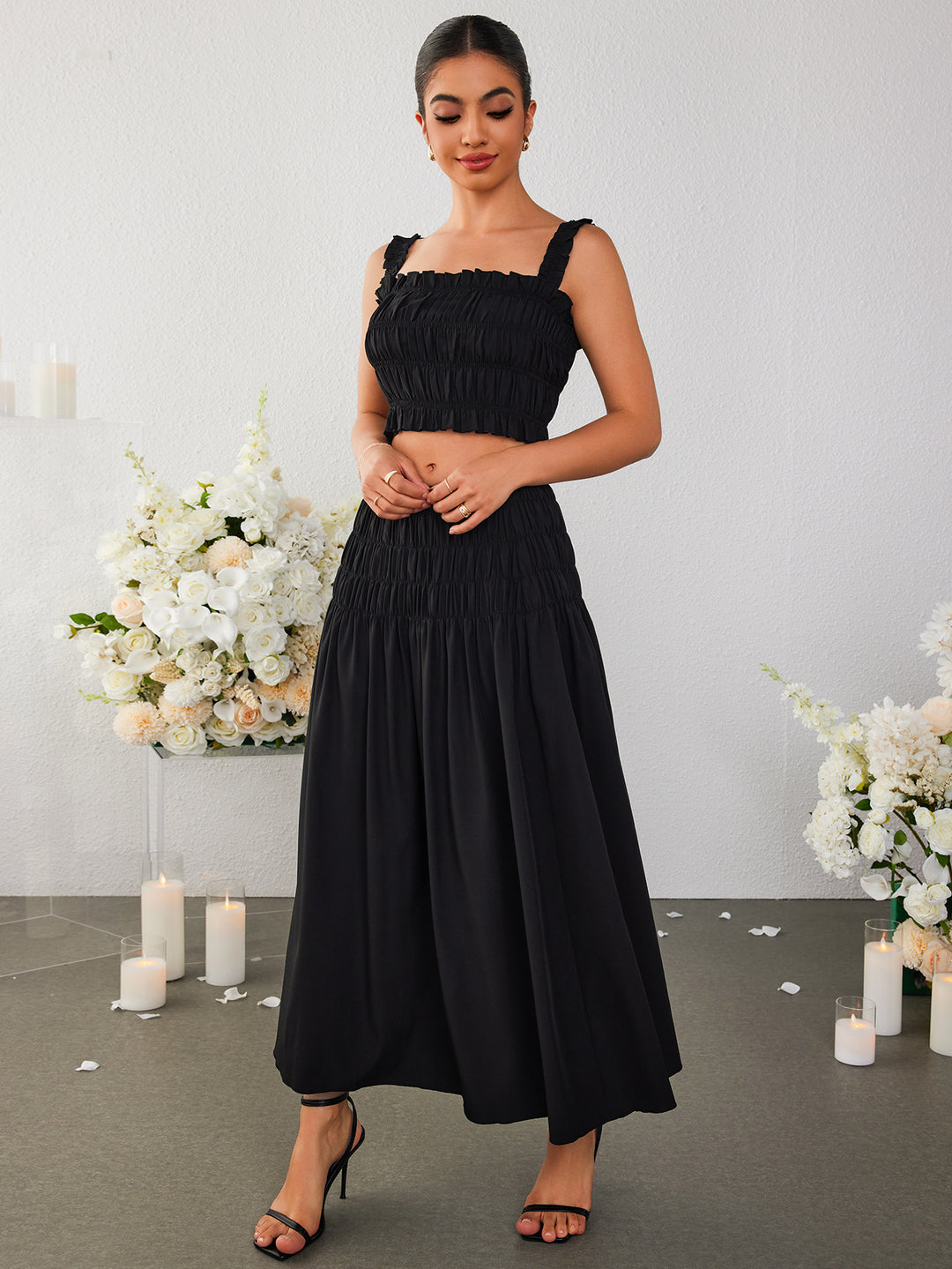 backless ruched crop top&flared hem ruffle skirt#color_black