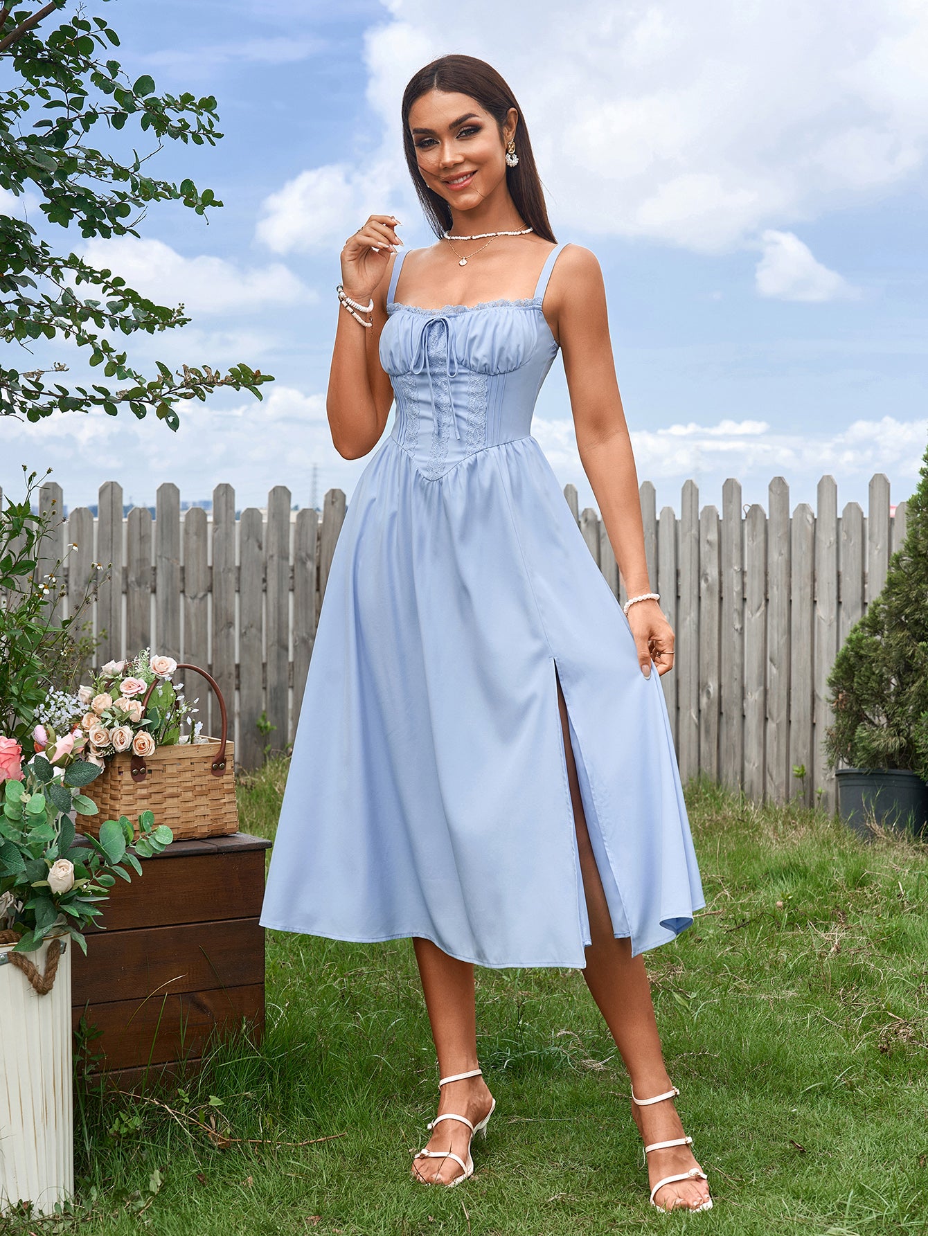 split thigh ruched bust tie front ruched cami dress#color_blue