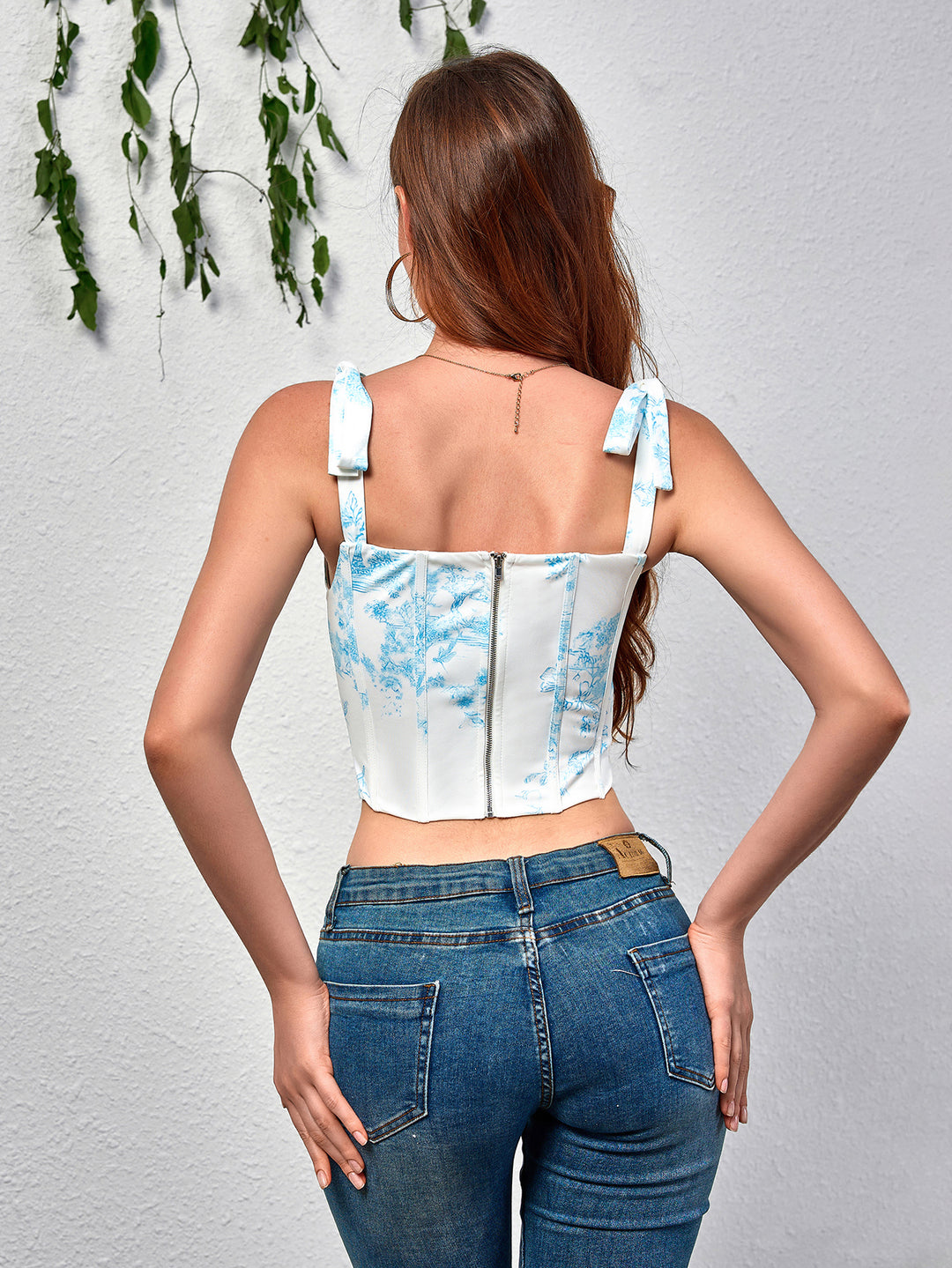 corset tie shoulder floral print top#color_blue